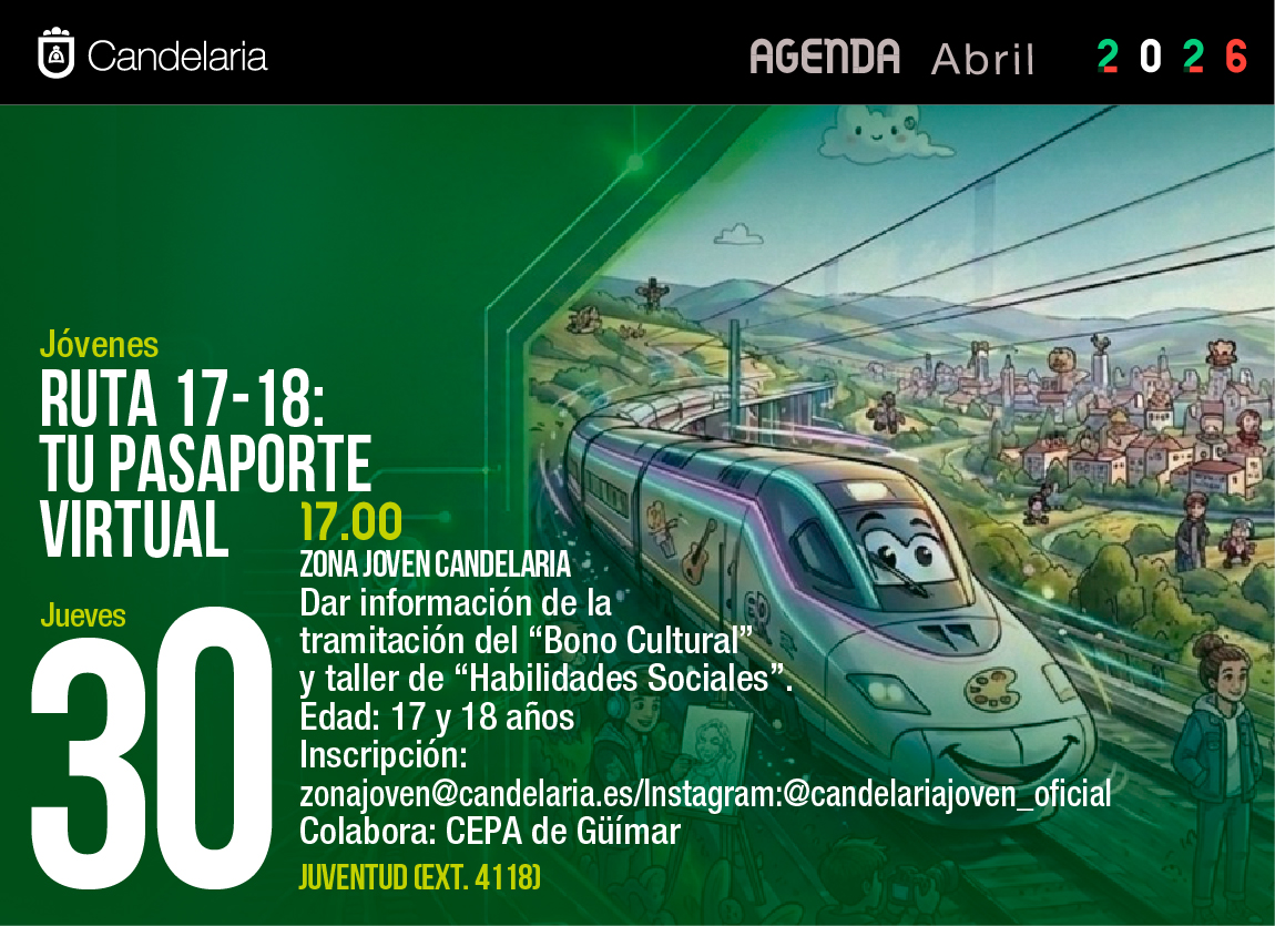 17:00 ZONA JOVEN CANDELARIA Information on applying for the 'Bono Cultural' and a 'Social Skills' workshop. Age: 17 and 18 years old. Registration: zonajoven@candelaria.es / Instagram: @candelariajoven_oficial. In collaboration with: CEPA de Güímar.